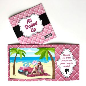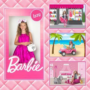 These are so much fun! We get to play dress up and pretend different scenarios! First, we pose in the giant doll box. You can choose to wear a fancy dress or a themed outfit like gymnastics or rock n roll. Then we go shopping, go to the beach, and finally head to bed. See sample images below.